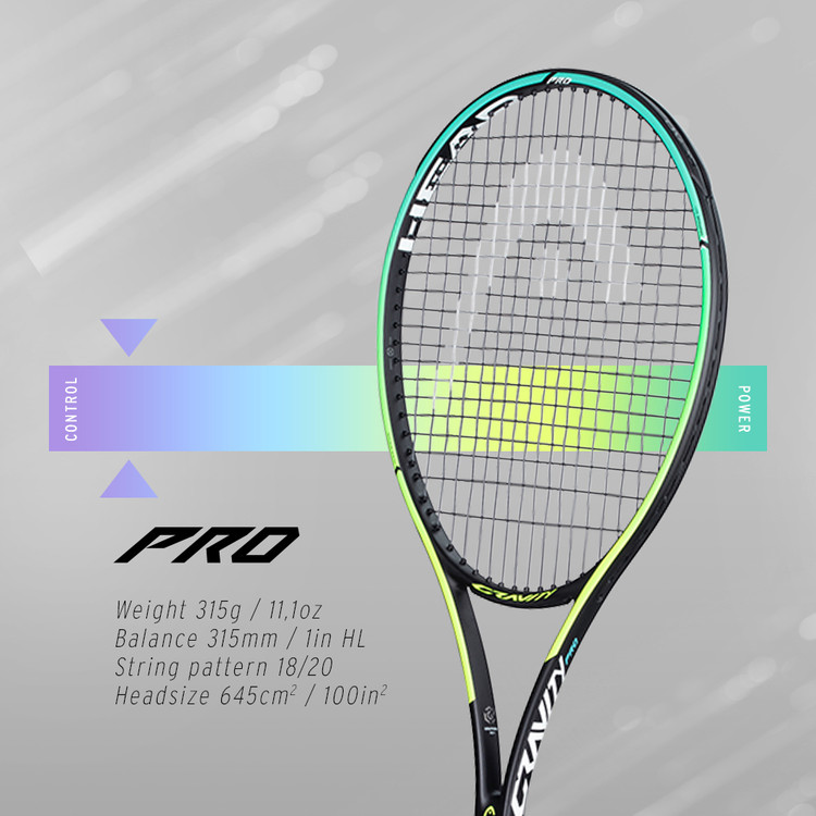 راکت تنیس هد گرویتی پرو GRAVITY PRO با یک طراحی جدید و خلاقانه، از یک طرف به رنگ سبز/ زرد و در طرف دیگر با یک رنگ بنفش/ آبی، یک راکت مدرن و زیبا برای بازیکن با سبک تهاجمی است. GRAVITY PRO در حالی که الگوی زه کشی 18/20 کنترل مورد نیاز بازیکنان مسابقات را فراهم می کند از فناوریGraphene 360+ ، ترکیبی از انتقال انرژی و الیاف مارپیچ نوآورانه برای افزایش انعطاف پذیری و تأثیر بالای ضربه برخوردار است. سری راکت های GRAVITY توسط الكساندر زورف و اشلی بارتی تأیید می شوند.